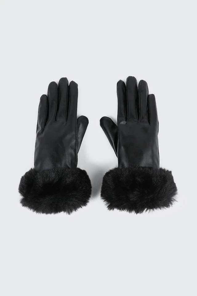 Ardene Faux Leather Gloves with Faux Fur Cuffs in Black | Faux Leather/Polyester