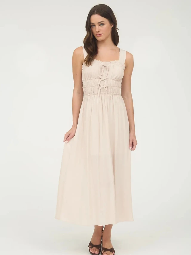 Pumpkin Shirred Front Tie Detail Sleeveless Midi Dress