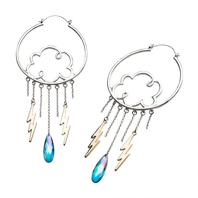 Stainless Steel with Silver Plated Clouds and Gold Plated Dangling Lightning Bolt Plug Hangers