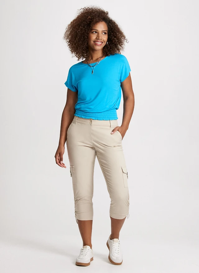 Smocked Waist T-Shirt & Cropped Drawstring Hem Cargo Pants