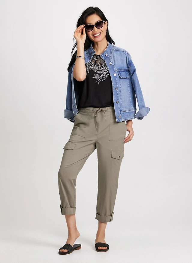 Smocked Waist T-Shirt & Rolled-Cuff Denim Capris
