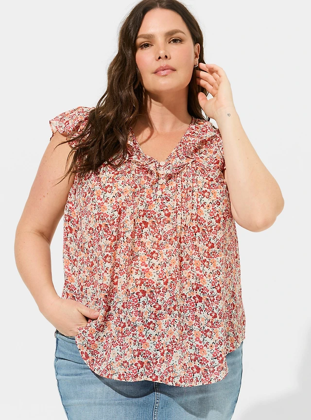 Embroidered Crinkle Chiffon Crochet Lace Trim Tank