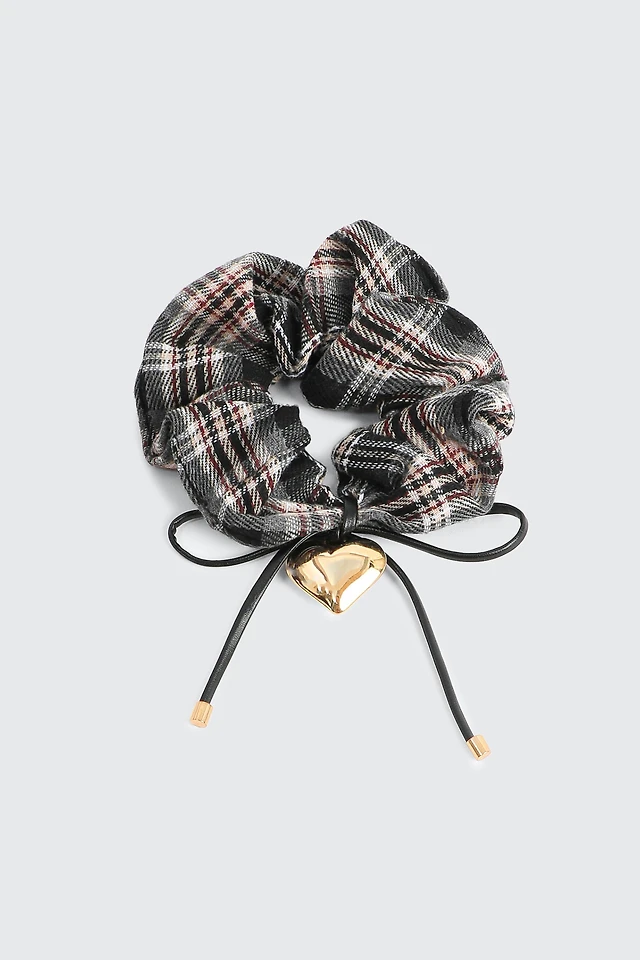 Ardene Plaid Scrunchie with Charms in Black | Polyester