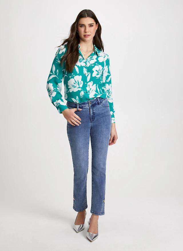 Pinched Sleeve Floral Print Top & Button Hem Jeans