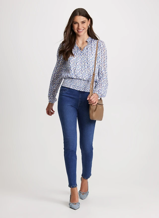 Floral Ruffle Neck Blouse & Pull-On Slim Leg Jeans