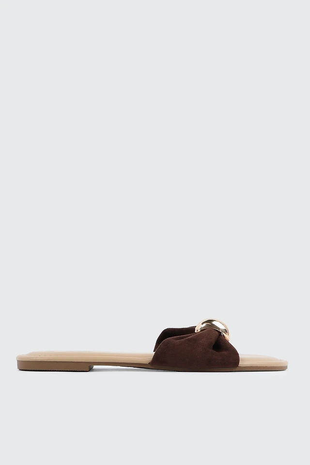 Ardene Flat Sandals with Gold Ornament in Brown | Size | Faux Suede