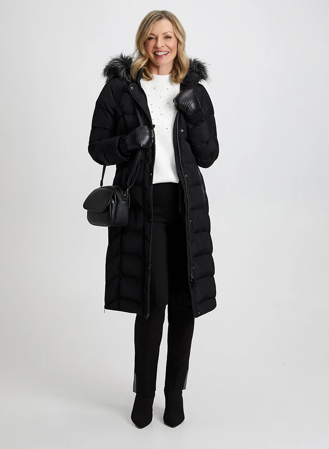 Stretch Vegan Down Coat & Pointelle Knit Sweater