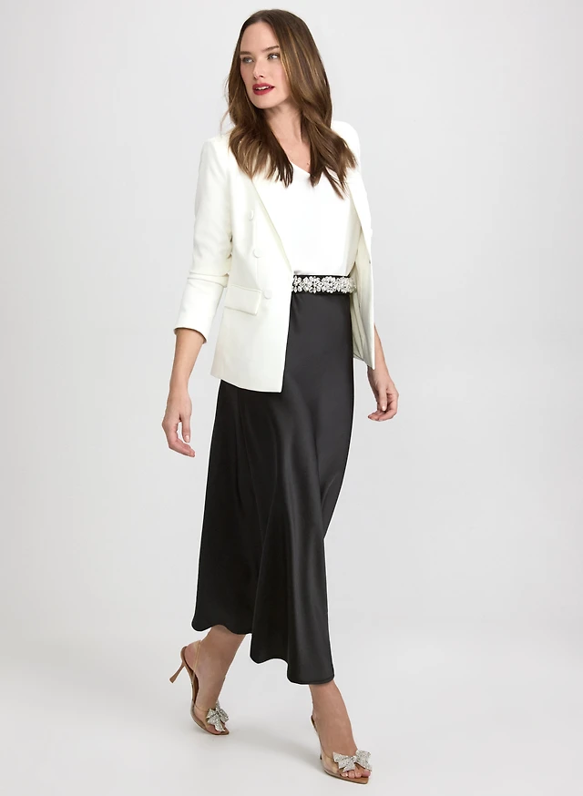 Peaked Lapel Blazer & Satin Bias Cut Skirt