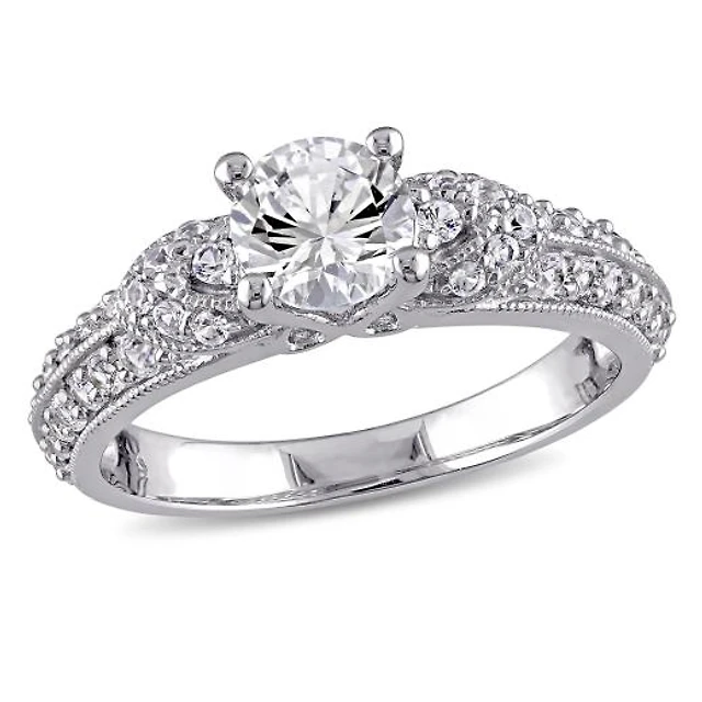 Oval Lab-Created White Sapphire and 0.18 CT. T.W. Diamond Ornate Frame Split Shank Vintage-Style Ring 10K Gold