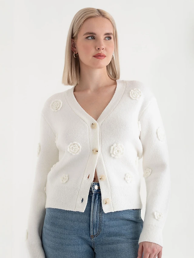 Roll-Edge Buttoned Long-Sleeve Cardigan