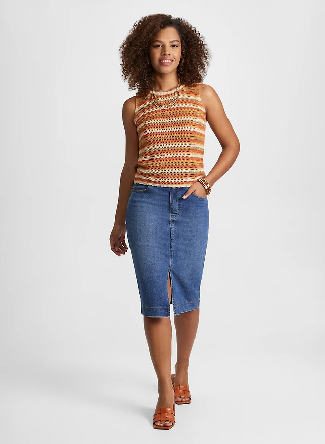 Denim Pencil Skirt & Crochet Trim Cap Sleeve T-Shirt