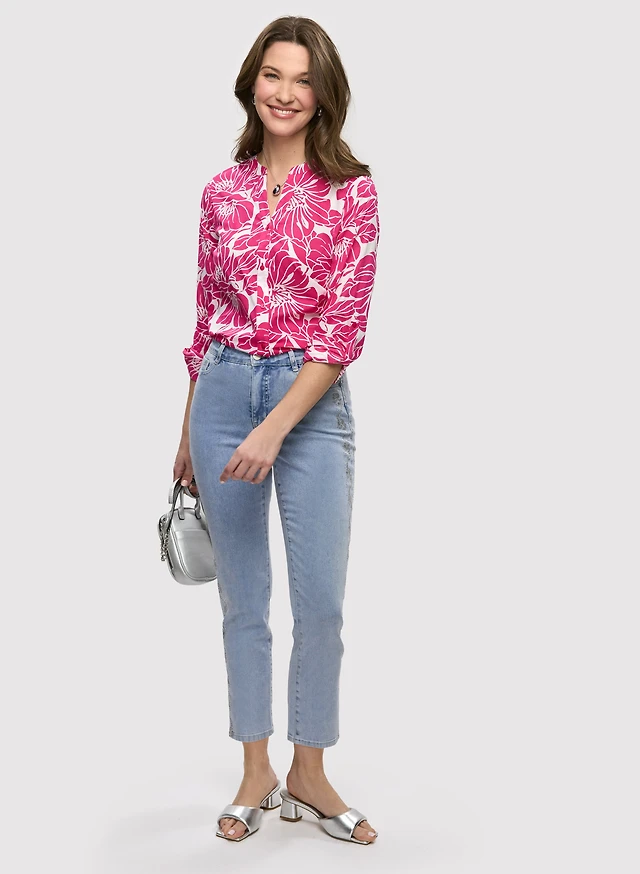 Tie-Front Floral Blouse & Embellished Denim Capris