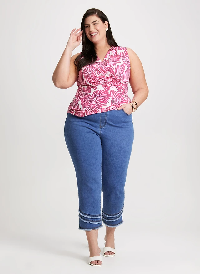 Leaf Print Sleeveless Top & Pull-On Frayed Capri Jeans