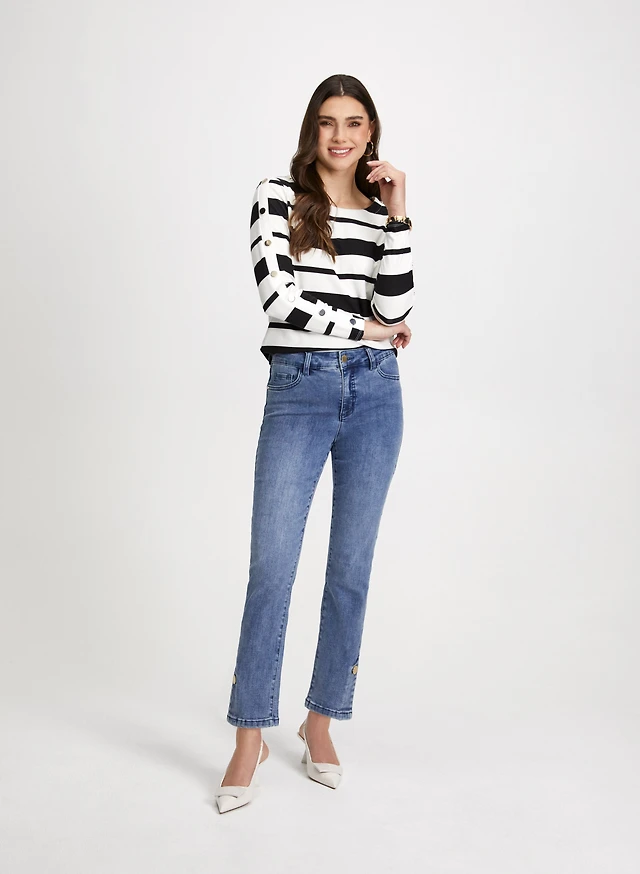 Stripe Print Top & Button Hem Jeans