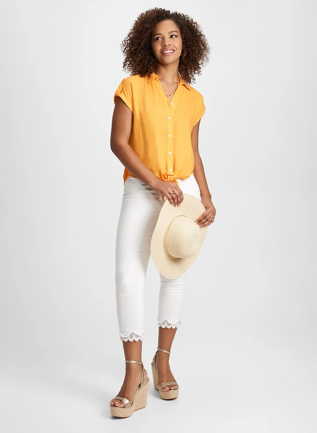 Linen-Blend Fringe Sleeve Blouse & Embroidered Hem Capri Jeans