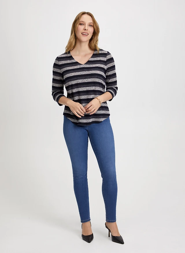Quilted Coat With Contrast Stripe Sweater & Pull-On Jeans