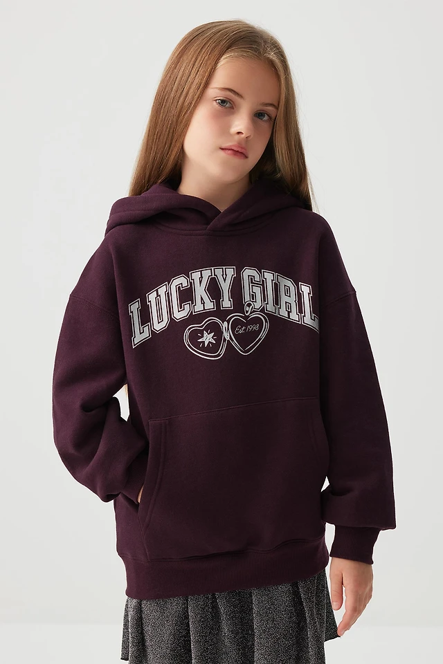 Ardene Kids Lucky Girl Hoodie in Burgundy | Size | Polyester/Cotton | Fleece-Lined