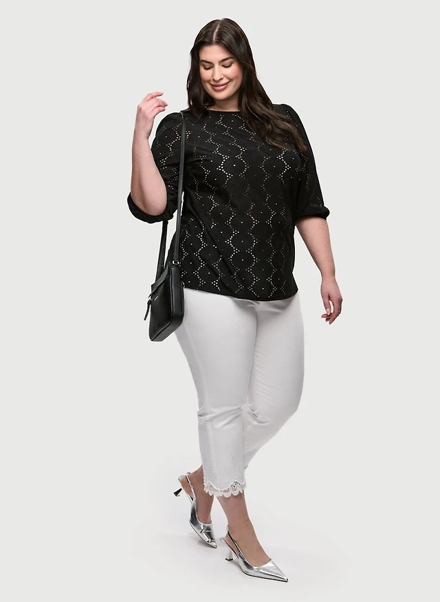 Boat Neck Eyelet Top & Lace Hem Denim Capris
