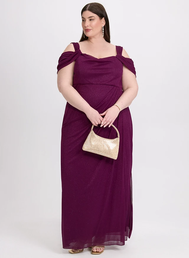 Glitter Velvet Drape-Neck Spaghetti-Strap Maxi Dress with Side Slit