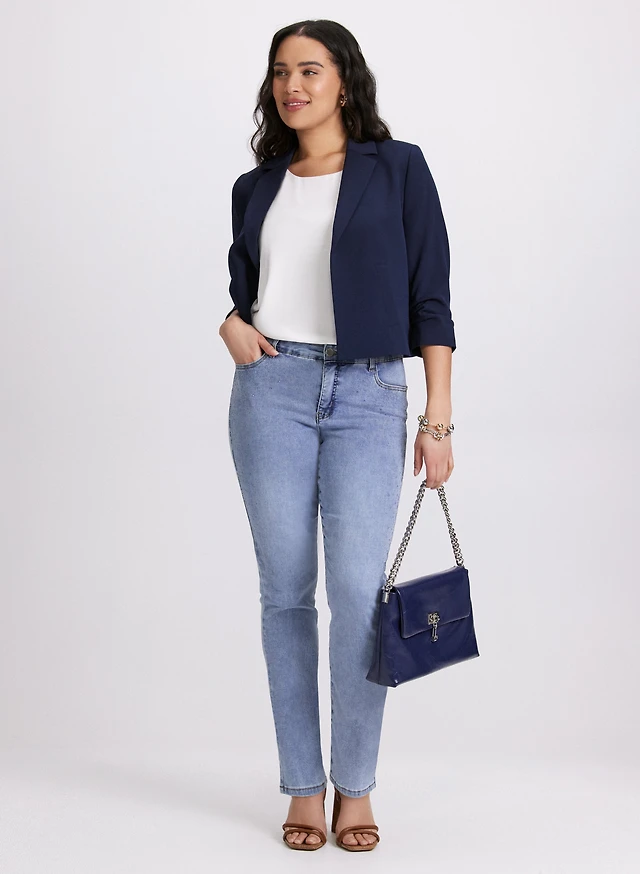 Open Front Blazer & Tonal Stone Embellished Straight-Leg Jeans