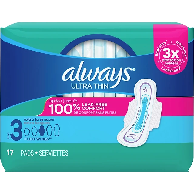 Always Ultra Thin Daytime Pads with Wings, Size 3, Extra Long Super, Unscented, 17 Count