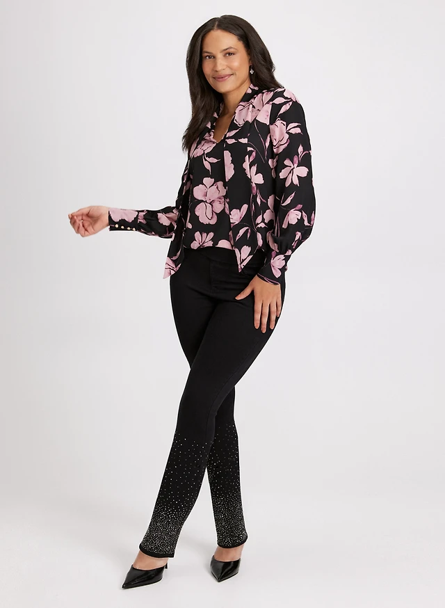 Tie Neck Long Sleeve Blouse & Rhinestone Detail Straight Leg Jeans