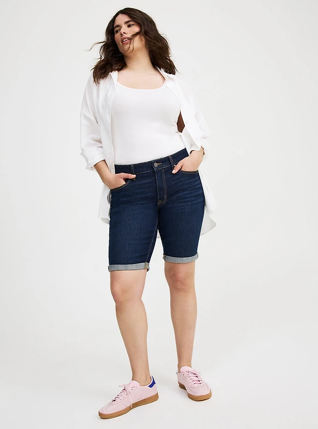 Women's Plus Dark Wash Double Cuffed Midi Short