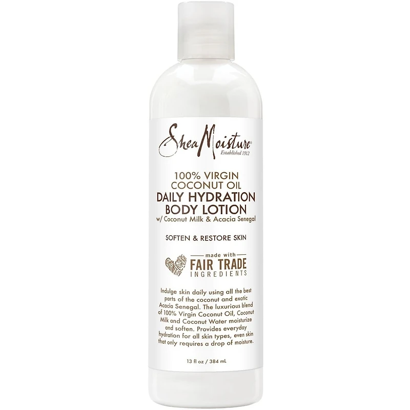 - SheaMoisture 100% Virgin Coconut Oil Daily Hydration body lotion moisturizes the skin, leaving it soft and feeling pampered;This moisturizing lotion is a luxurious blend of 100% Virgin Coconut Oil, Coconut Milk, Coconut Water, and Raw Shea Butter and nourishes and hydrates your skin;The Daily Hydration body lotion skincare is dermatologically tested and provides everyday hydration;Parabens, Sulfates, Phthalates, and Mineral Oil are not added in our Shea Moisture body lotions, and NOT tested on Animals;Give your skin a healthy glow with the moisturizing, rejuvenating skin body lotion
