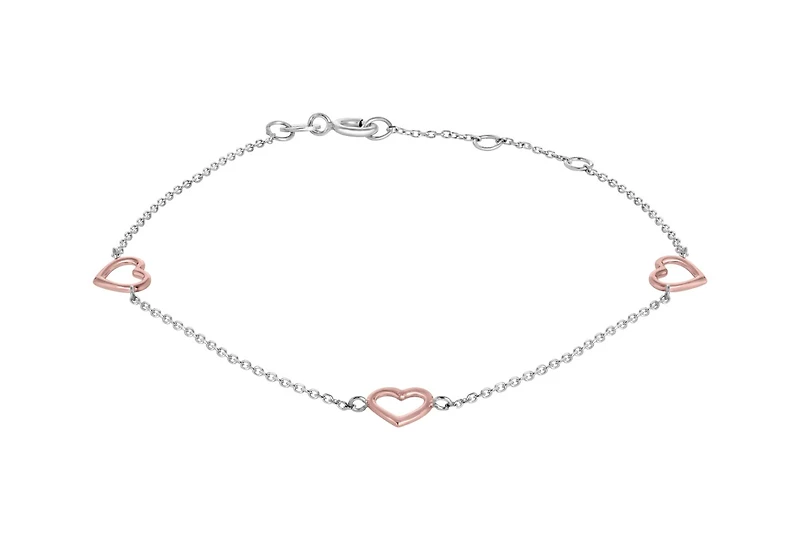 10K Rose and White Gold 10" 3 Stations Open Heart Ankle Bracelet