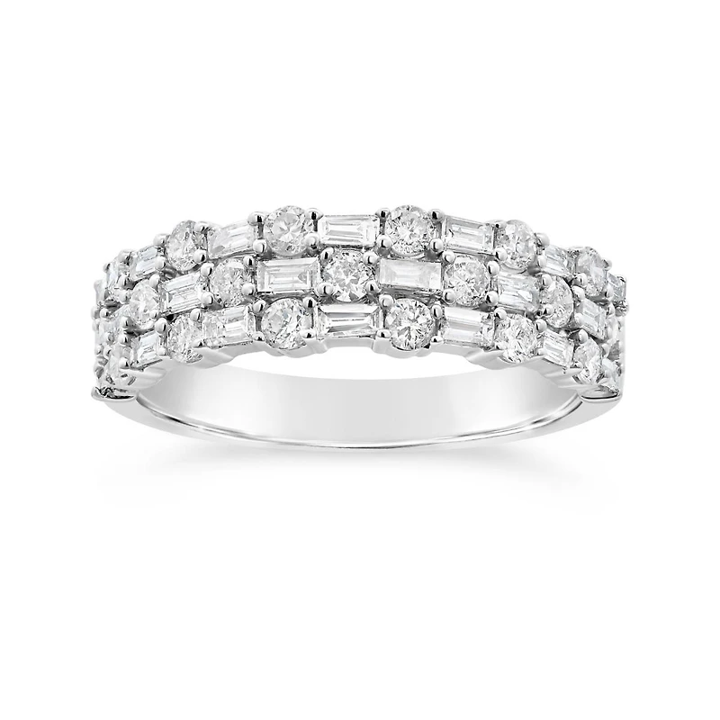 Experience the epitome of luxury with the 10K White Gold 1.00CTW Diamond Band. This exquisite ring boasts a captivating design featuring three rows of diamonds intricately set in a combination of baguette and round cuts. The lustrous 10K white gold enhances the brilliance of the diamonds, creating a dazzling display of light and sparkle. With a total carat weight of 1.00, this band exudes opulence and sophistication. Whether worn as a statement piece or to complement other rings, this diamond band is a timeless addition to any jewellery collection. Elevate your style with the elegance and enduring beauty of this 10K white gold diamond band.