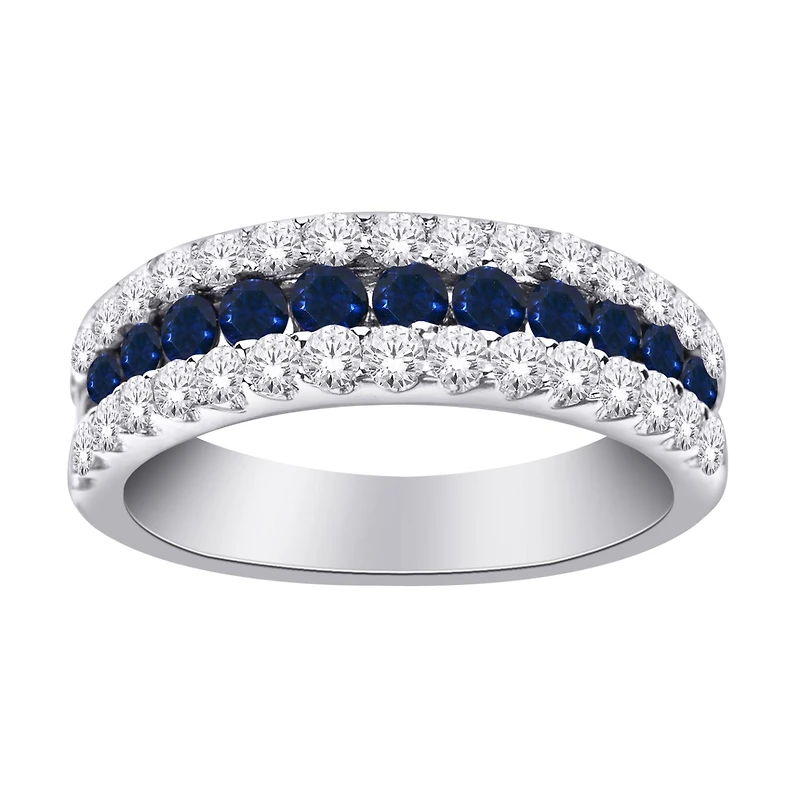 Classic brilliance meets modern refinement in this 10K white gold band featuring a sleek channel-set design. A vibrant row of created blue sapphires runs through the center, while sparkling lab grown diamonds are delicately positioned above and below—framing the sapphires with icy shimmer and adding depth to the layout.