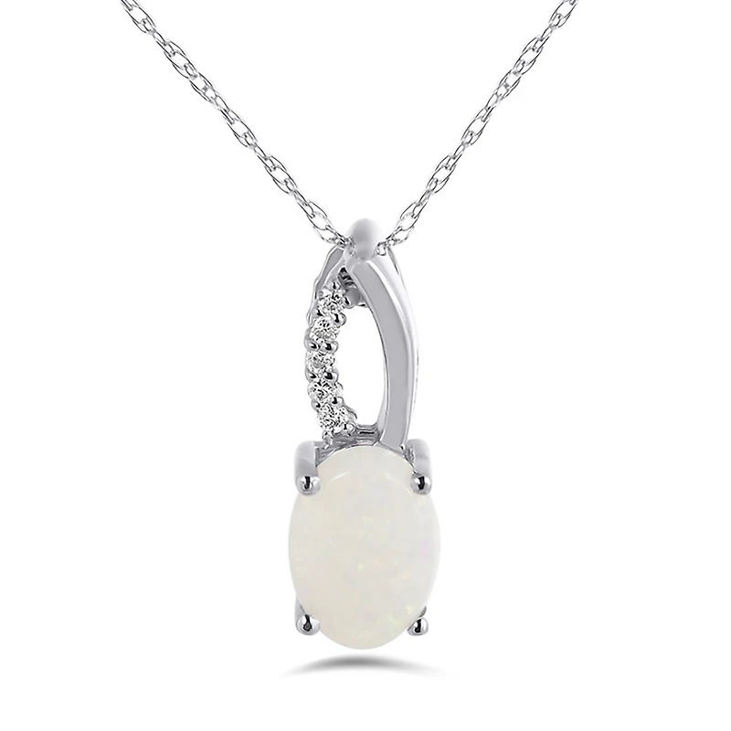 This 10k white gold fashion pendant features a single oval cut opal gemstone accented by shimmering diamonds. The pendant hangs from a 17" gold chain.