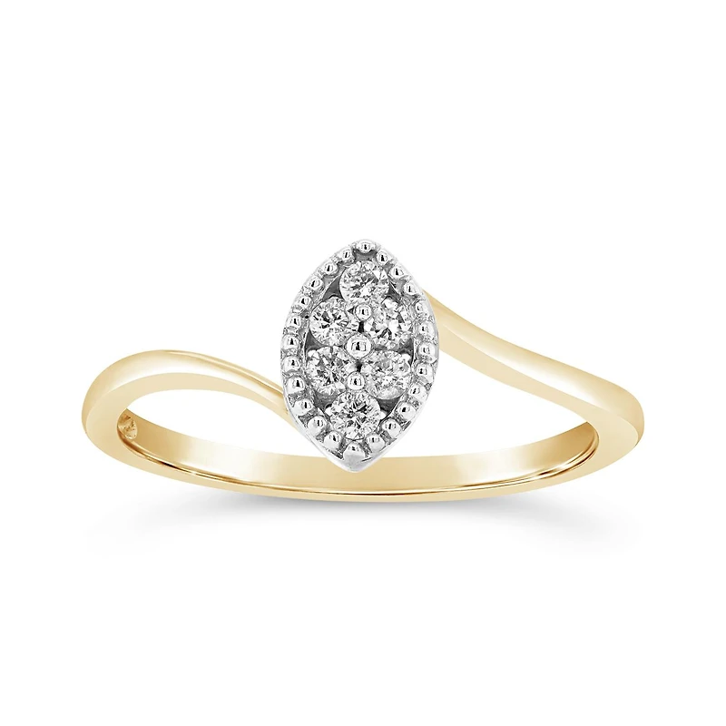 Introducing the elegant 10K Yellow Gold 0.10CTW Diamond Marquise Shaped Promise Ring, a dazzling and meaningful piece of jewellery that beautifully combines sophistication and sentiment. This ring is designed to symbolize a promise made from the heart, with a unique and eye-catching marquise-shaped design. Crafted from 10-karat yellow gold, this ring offers a warm and radiant glow. Yellow gold is known for its timeless appeal and adds a touch of luxury to the overall design. The centerpiece of the ring is a stunning marquise-shaped diamond cluster. With a total carat weight of 0.10, these diamonds are carefully selected to exude brilliance and captivate attention. The marquise shape, with its elongated and tapered ends, adds a touch of elegance and uniqueness to the ring.