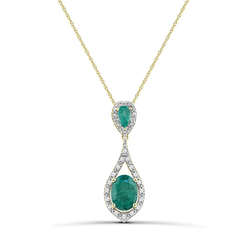 This bold and bright emerald and diamond pendant from our Marseille Collection is crafted in 10-karat yellow gold and features oval and pear cut genuine emeralds at its centre surrounded by shimmering diamonds. With vibrant gemstone colour and brilliant luster, this pendant is sure to make a standout addition to any jewellery collection.