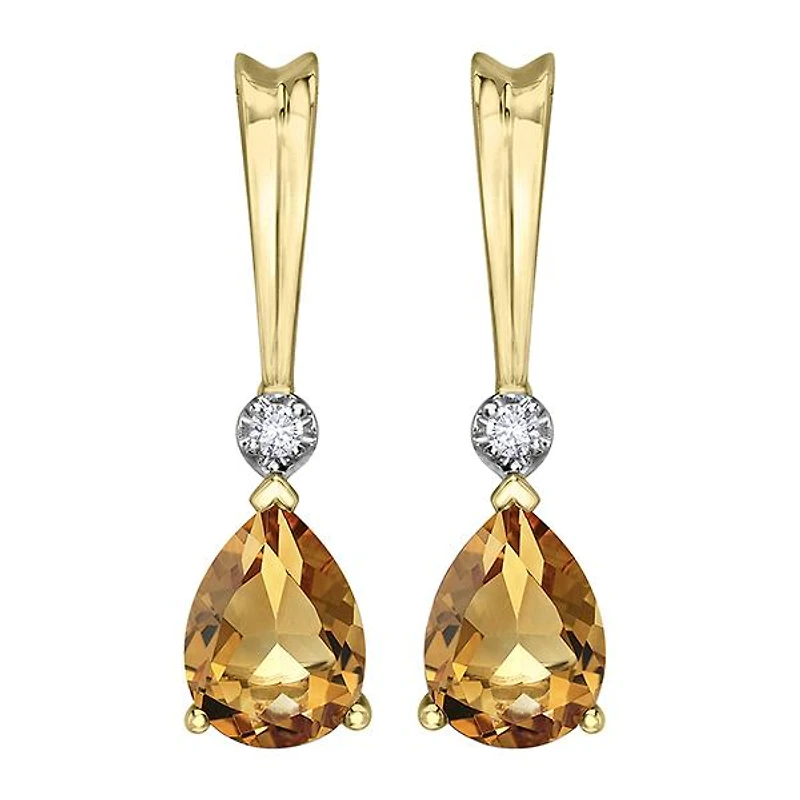 These gorgeous earrings feature a pear cut citrine accented by a shimmering diamond. These earrings are set in 10k gold and enhanced with a high polish finish. Citrine is the November birthstone, making this earring the ideal choice as a birthday gift, or adding a touch of class to your own jewellery collection.