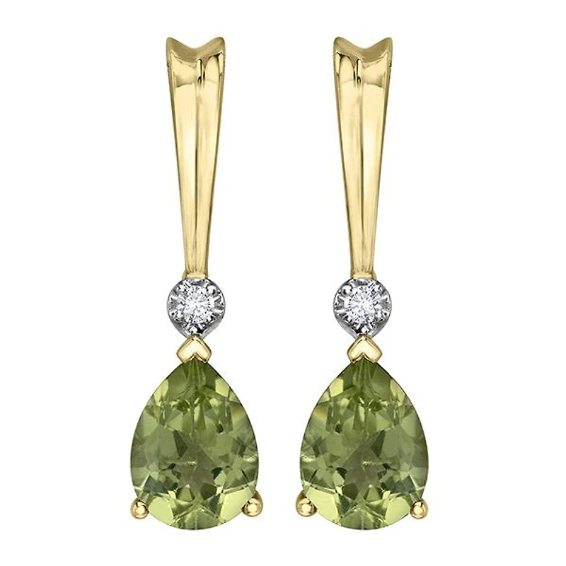 These gorgeous earrings feature a pear cut peridot accented by a shimmering diamond. These earrings are set in 10k gold and enhanced with a high polish finish. Peridot is the August birthstone, making this  earring the ideal choice as a birthday gift, or adding a touch of class to your own jewellery collection.