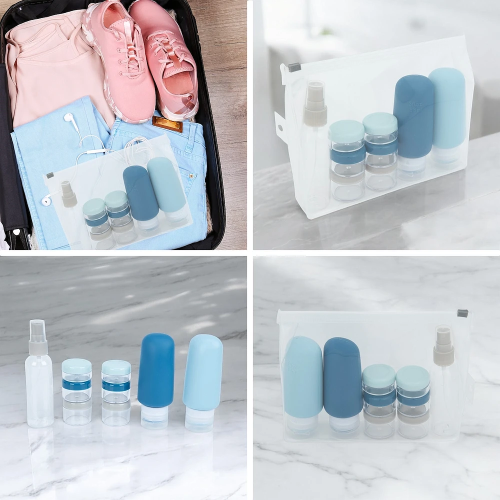- Clear, Zip-Lock Closure Storage PouchTotal Of 9 Bottles: 2 Squeezable Bottles 6 Hard Cylinder Jars 1 Spray BottleAll Bottles Are Able To Hold Your Hair Products, Skincare And PillsTravel-SizedLightweight