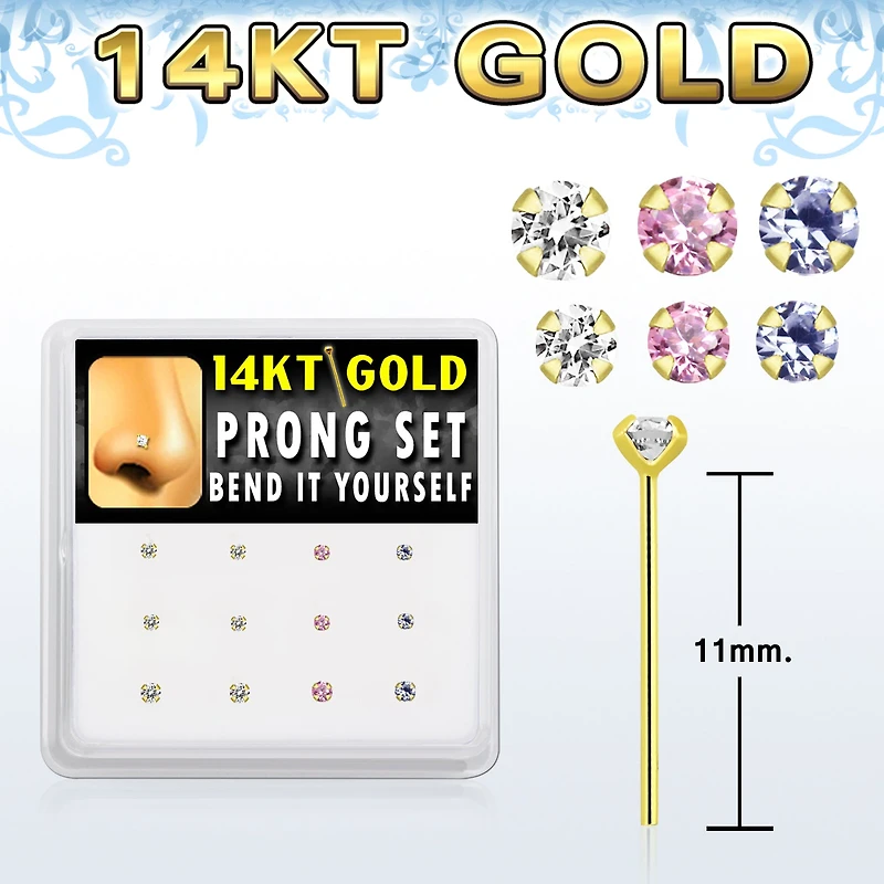 22G(0.6mm) 14Karat Solid Gold Self Bending Nose Studs With 1.5mm And 2mm Prong Setting Colour Cubic Zirconia Stones. Sold Individually.