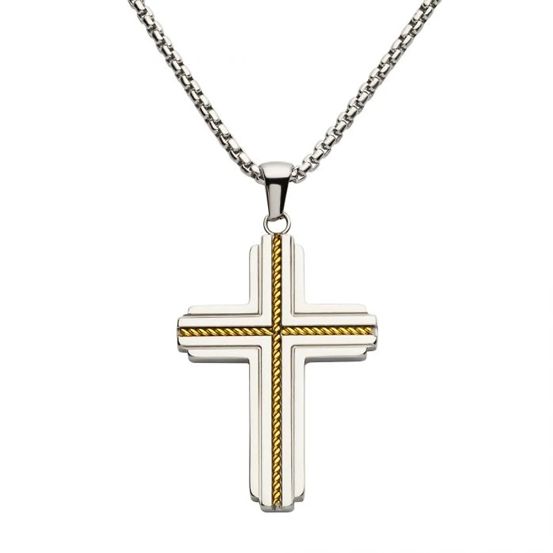18Kt Gold IP Steel Rope Inlay Two-Tone Cross Pendant With Chain