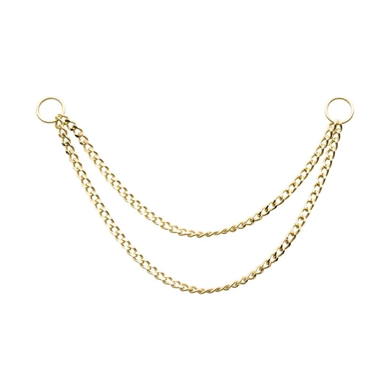 14Kt Yellow Gold 2 Tier Curb Chain With Ring. Made From Pure 14Kt Nickel-Free Gold. Connect Two Piercings Using The 2mm Rings On Each End. Available In A Wide Variety Of Lengths To Suit Any Ear Curation Or Nostril Placement. All Lengths Of Chain Are 0.35mm In Thickness. Ring: 2mm (ID) X .35mm (THK)