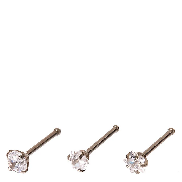 20G Silver-tone Stainless Steel Cubic Zirconia Mixed Shape Nose Studs - 3 Pack
