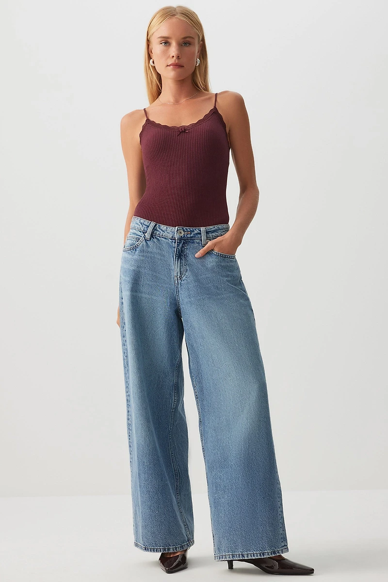 Seamless bodysuit in ribbed knit. V-neck Spaghetti straps Thong cut Snap crotch closure Model is wearing size XS/SFor size XS/S, select SFor size L/XL, select LComposition & Care 69% modal, 26% polyester, 5% elastane Hand wash in cold water Lay flat to dry Do not bleach Ion on low setting if needed Do not dry-clean | Ardene Lace Trim V-Neck Bodysuit in Burgundy | Size Small | Polyester/Elastane