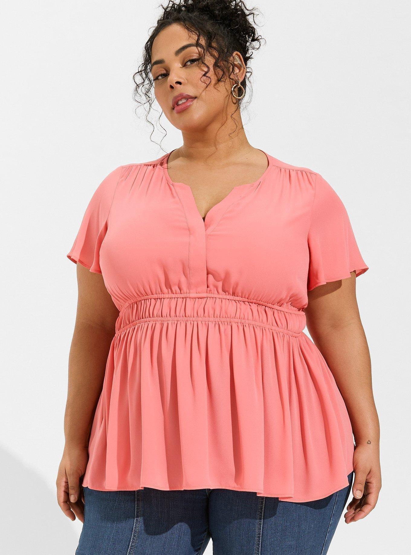 FIT Measures 30"" from shoulder (size 2). MATERIALS + CARE Georgette woven fabric: Long-lasting, breathable, slightly sheer and super low-maintenance--what more could you ask for in a fabric? Stretch level: None. 100% polyester. Machine wash cold. Dry low. Imported. DETAILS Notched crew neck. Short flutter sleeves. Elasticized waist.