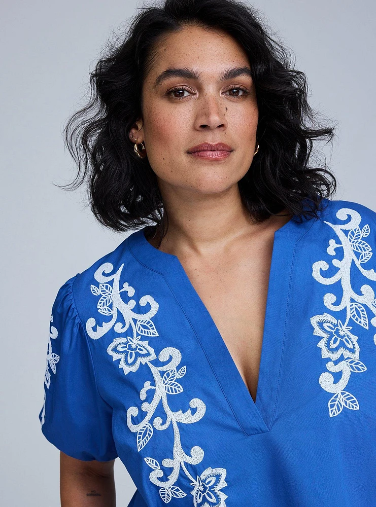 FIT Relaxed, boxy fit. Measures 27'' from shoulder (size 2). MATERIALS + CARE Cotton poplin woven fabric. 100% cotton. Machine wash cold with like colors, tumble dry low. Imported. DETAILS Deep v-neck. Embroidered placket detail. Short embroidered puff sleeves. Belle Isle Pretty in the park. Classic by the coast. Fresh, feminine and always effortless. Belle Isle makes getting dressed a celebration.