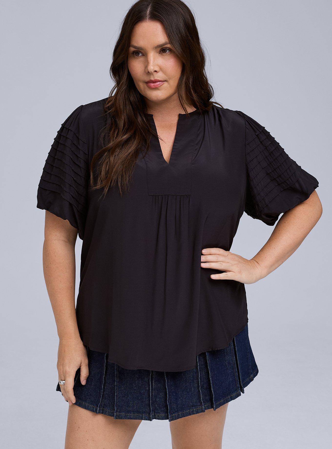 FIT Relaxed fit. Measures 30'' from shoulder (size 2). MATERIALS + CARE Rayon viscose woven fabric. 55% rayon, 45% viscose. Machine wash cold. Tumble dry low. Imported. DETAILS Notched v-shaped neckline. Elbow-length bubble sleeves with pleated details. Shirring at center front and shoulder seams. BELLE ISLE Pretty in the park. Classic by the coast. Fresh, feminine and always effortless. Belle Isle makes getting dressed a celebration.