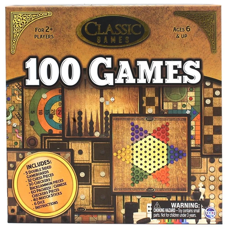Your favorite Classic Games all in one convenient package! Includes everything you need to play from 2 or more players ages 6 and Up. You'll discover an array of over 100 classic games including chess, tublesticks, checkers, backgammon, pacheesi, snakes and ladders and more! Quality linen-feel packaging. Game Play Information:Number of players: 2 to 6 Age of Players: 6 to 99 YearsSkill level: IntermediateTime to Learn in Mins: 10Time to Play in Mins: 60Profanity: NoBatteries Included: Not RequiredBattery Details: Choking Hazard: YesAdditional Information:Publisher: TCG Toys Item ID: 686141010247 Product Dimensions: 11" x 11" x 2.75" Language: Bilingual (English/French)Country of Origin: CN