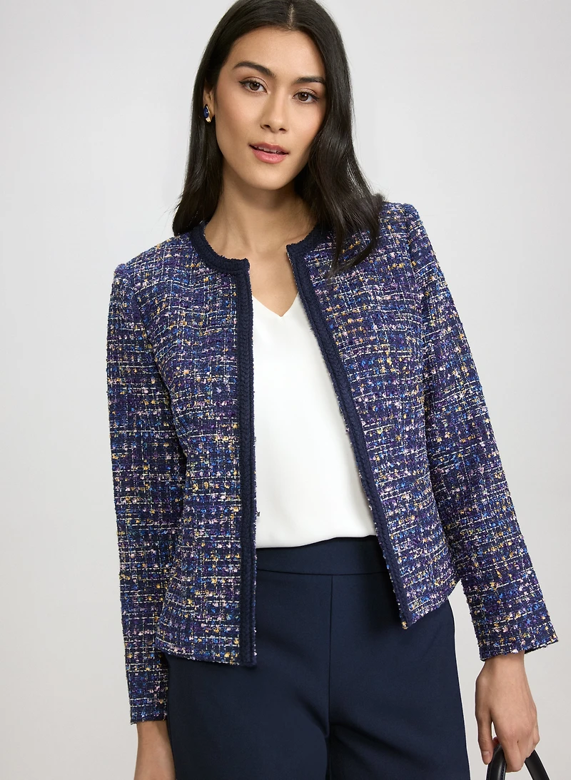 Our collarless tweed jacket stands out with its cropped fit and clean style, perfect for a contemporary and sophisticated look. Pair it with high-waisted pants and metallic accessories.CollarlessLong sleeveHook front closureHook closureContrast braided trim along neckline & placketTweed fabricHighest shoulder point: 22"