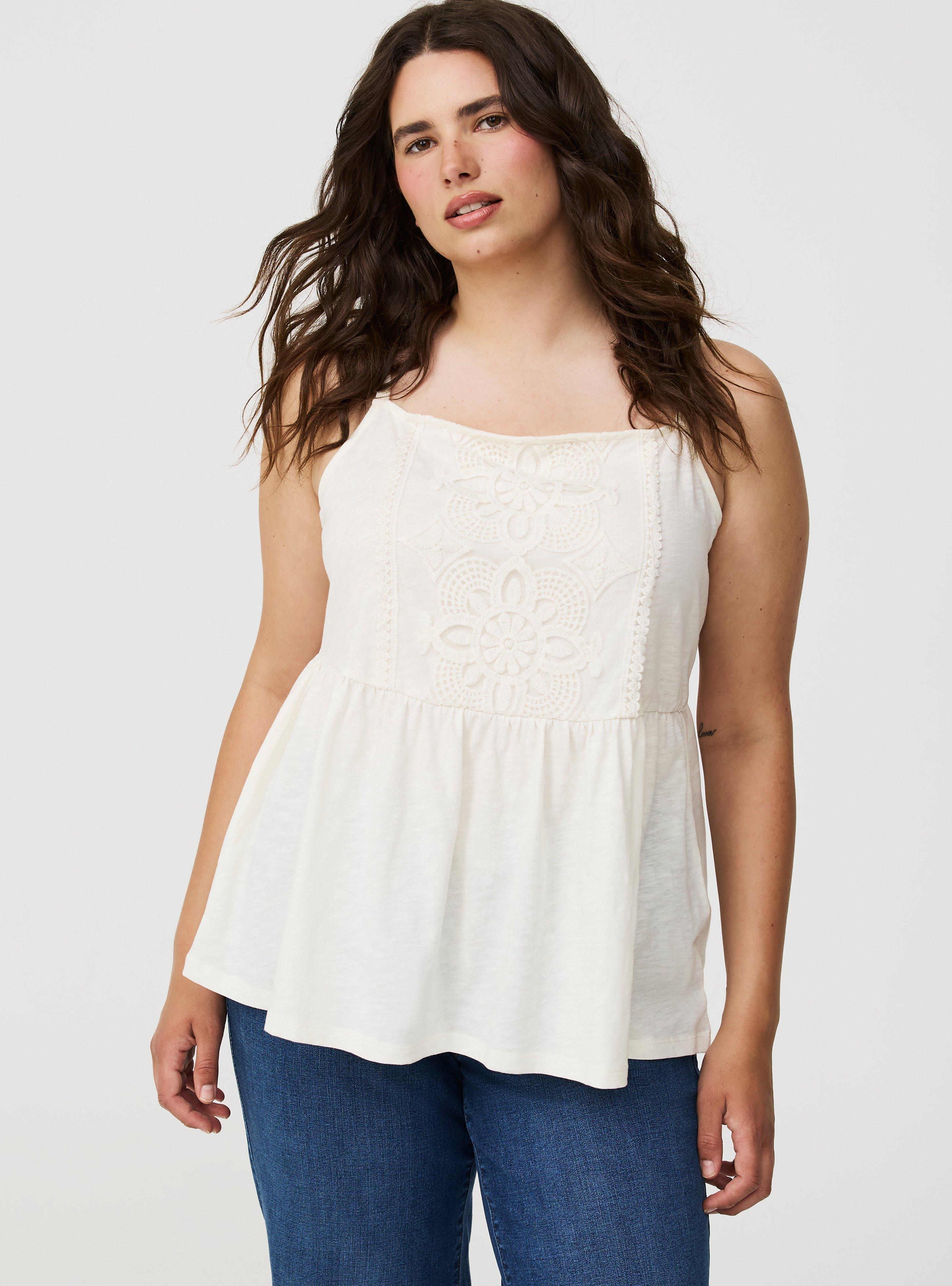 FIT Measures 29'' from shoulder (size 2). MATERIALS + CARE Heritage Slub knit fabric: Your essential, textured cotton fabric. Stretch level: Maximum. 100% cotton. Machine wash cold. Tumble dry low. Imported. DETAILS Square neckline. Sleeveless. Crochet panel. Babydoll silhouette.