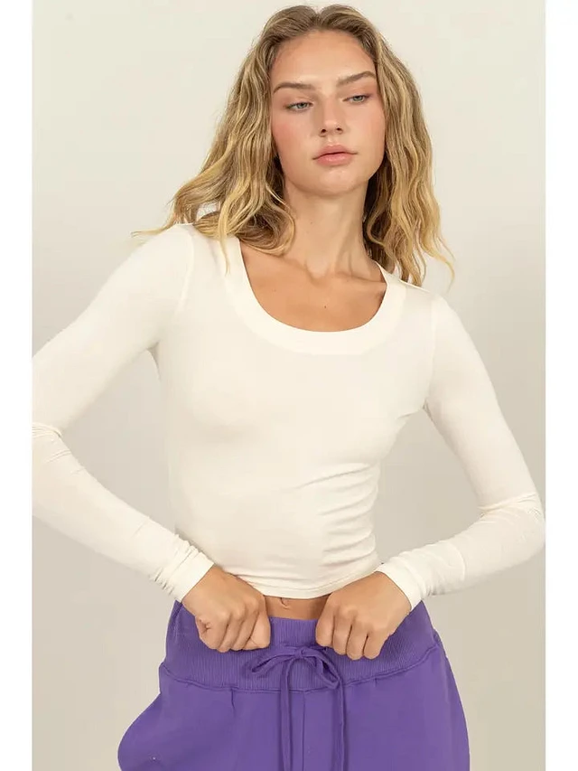 Super Soft Rib Scoop Neck Hook and Eye Long Sleeve Top