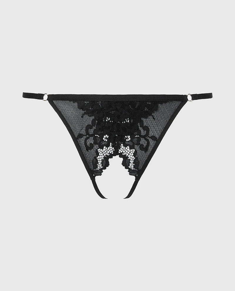 The Crotchless G-String with Romantic Lace in Tuxedo Black brings bold sophistication to your intimate collection. This daring piece features a romantic lace design in a sleek Tuxedo Black shade, crafted for those seeking playful confidence and allure in their lingerie wardrobe.  Delicate lace fabric construction provides an elegant, breathable feel with romantic appeal Imported 12% Spandex, 88% Polyamide
